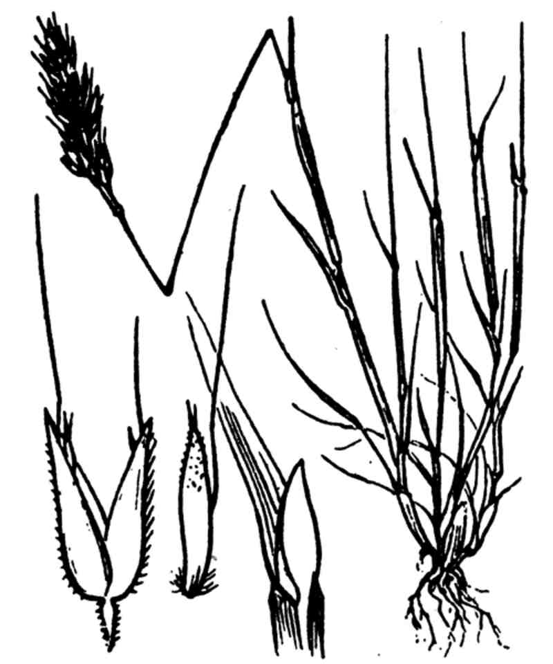 Fleurs : panicule petite (1-3 cm de long), spiciforme, oblongue, dense, à rameaux courts, dressés, un peu rudes; pédicelles plus courts que les épillets ou parfois les égalant, un peu épaissis au sommet; épillets de 3 mm, oblongs ; munies de poils courts à la base, aristées; glumes lancéolées-aiguës, scabres ; glumelle inférieure égalant presque les glumes, bifide, à arête 1-2 fois plus longue que les glumes.