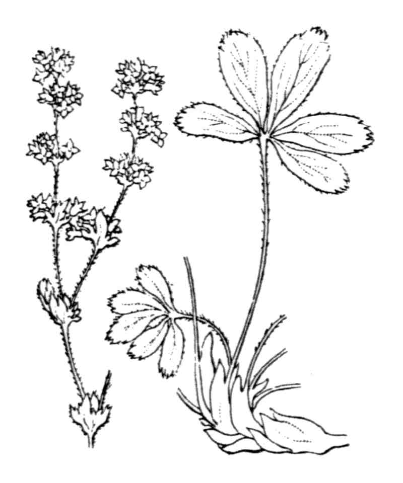 Feuilles : d'un vert sombre, luisantes sur le vif et glabres en dessus, velues-soyeuses et argentées-satinées en dessous, divisées jusqu'à la base en 5 folioles obovales ou obovales-oblongues, obtuses, dentées au sommet, à dents très petites et conniventes; [Folioles coriaces, larges, L/l 1.5-4]