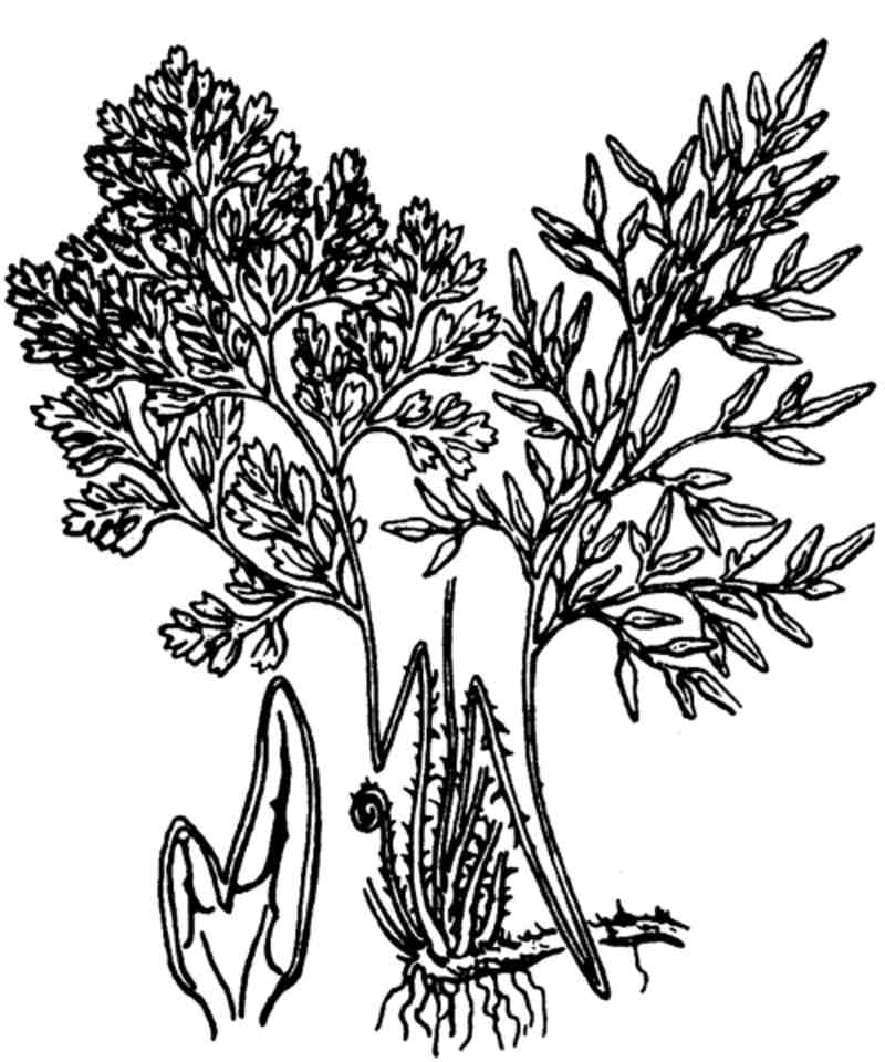 Feuilles : ovales ou oblongues, non atténuées à la base, à pétiole vert, nu, plus long que le limbe, tripennatiséquées : les stériles molles, à lobes obovales en coin et incisés-dentés au sommet ; les fertiles un peu plus longues, frisées, à lobes écartés, oblongs ou oblongs-linéaires, entiers ;
