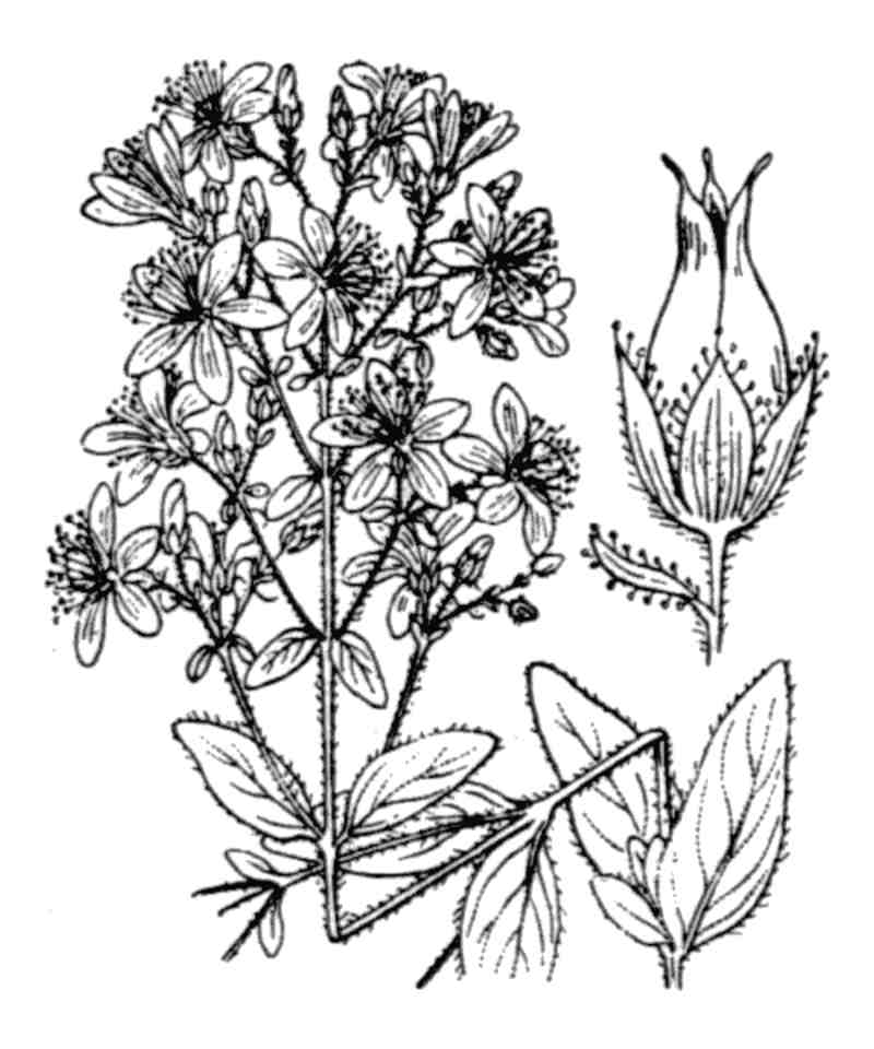 Flowers: 12-15 mm diam., in an elongated cyme; sepals linear, hairy and edged with glands; petals buff, narrow, glabrous; styles 3, medium.