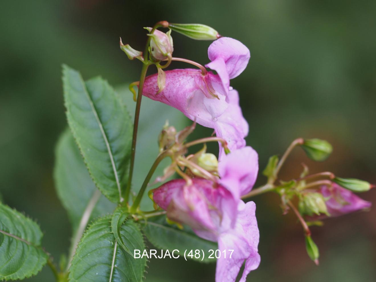 Flowers: 30-40 mm long, 20-25 mm diam.; sepals and petals pink or white, spotted with red, spur of lower sepal very small, recurved;