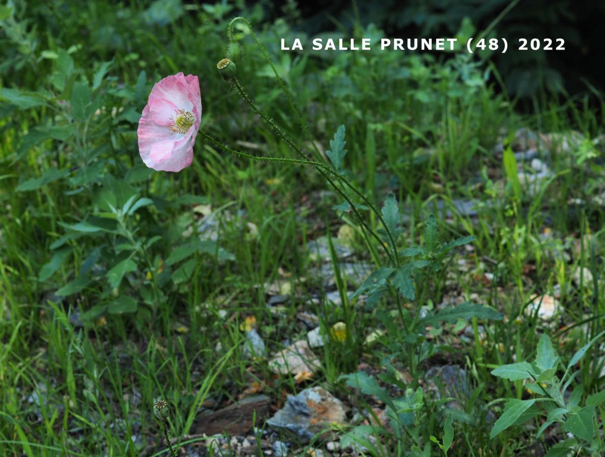 [Variété Shirley 'Reverend Wilks' (avec parfois les taches noirs à la base, et jamais les formes doubles, ce qui se différentie de var. Shirley) ] Plante annuelle, velue-hérissée; tige de 20-60 cm, dressée, rameuse;