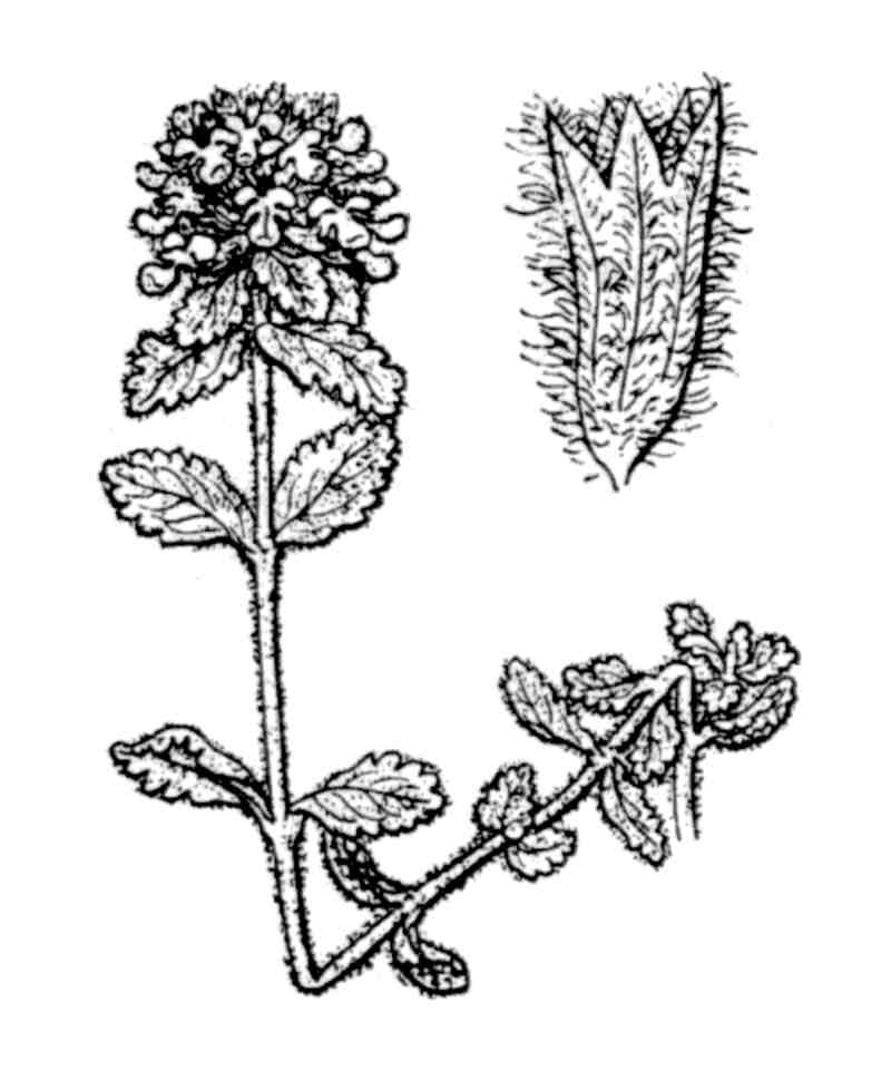 Fleurs : [corolles 6-9 mm de longueur, jaunâtres ou blanchâtre], ovoïdes ou globuleuses, solitaires ou agglomérées, serrées, fortement velues-tomenteuses; calice hérissé de longs poils étalés, à dents carénées, [calice à poils marginaux en majorité ramifiés] aiguës, la supérieure subobtuse; corolle à lobes supérieurs velus. [Barnard -> calice et inflorescence recouverts d'un tomentum blanc jaunâtre; corolle blanche ou d'un blanc-jaunâtre.]